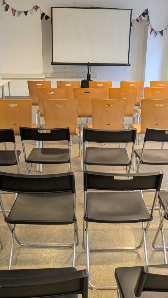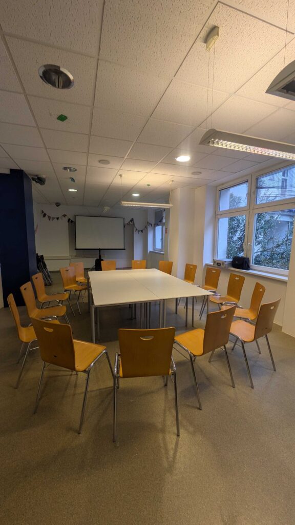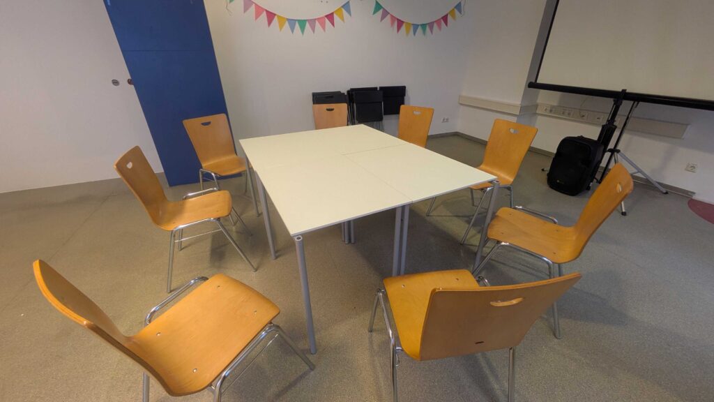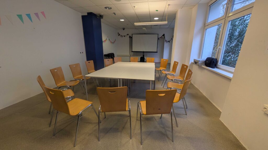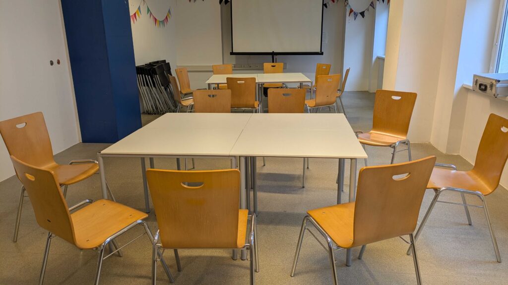 Der MILA Community-Raum steht allen offen! Hell, freundlich und flexibel ausgestattet, bietet er auf 52 m² Platz für ca. 30 Personen – ideal für Workshops, Seminare, Klausuren, Kindergeburtstage, Nachbarschaftsprojekte, Yoga oder kleine Kulturveranstaltungen.