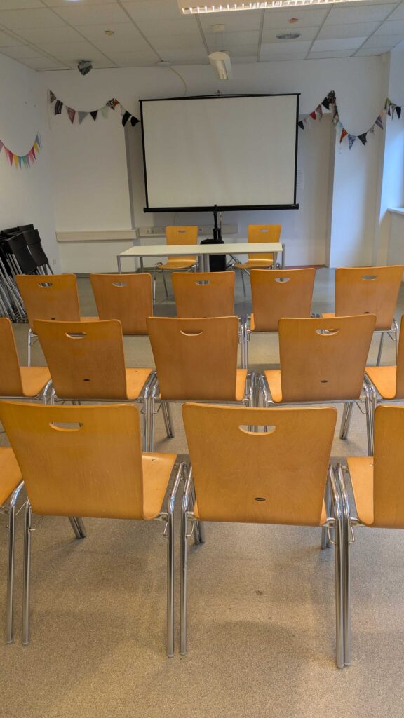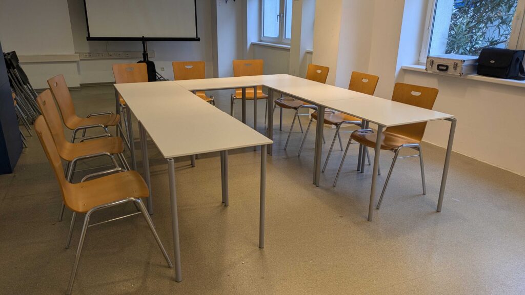 – Die Einrichtung lässt sich einfach an deine Bedürfnisse anpassen – egal, ob du Stuhlreihen für eine Präsentation, Tische für gemeinsames Arbeiten oder einen freien Raum für Bewegung brauchst. Es gibt 8 Tische und 30 Sessel.