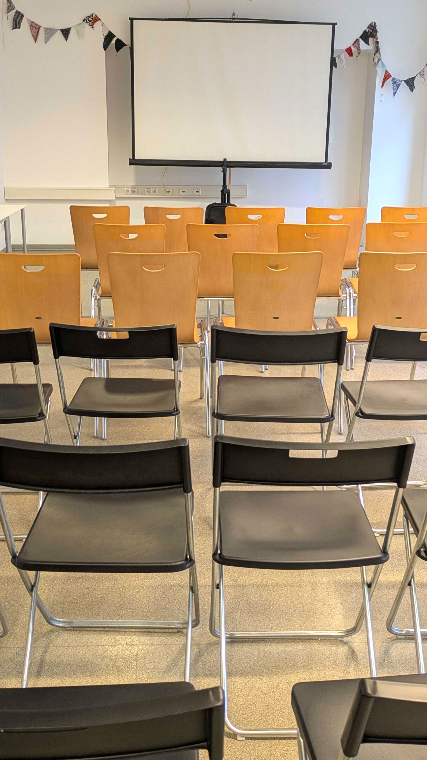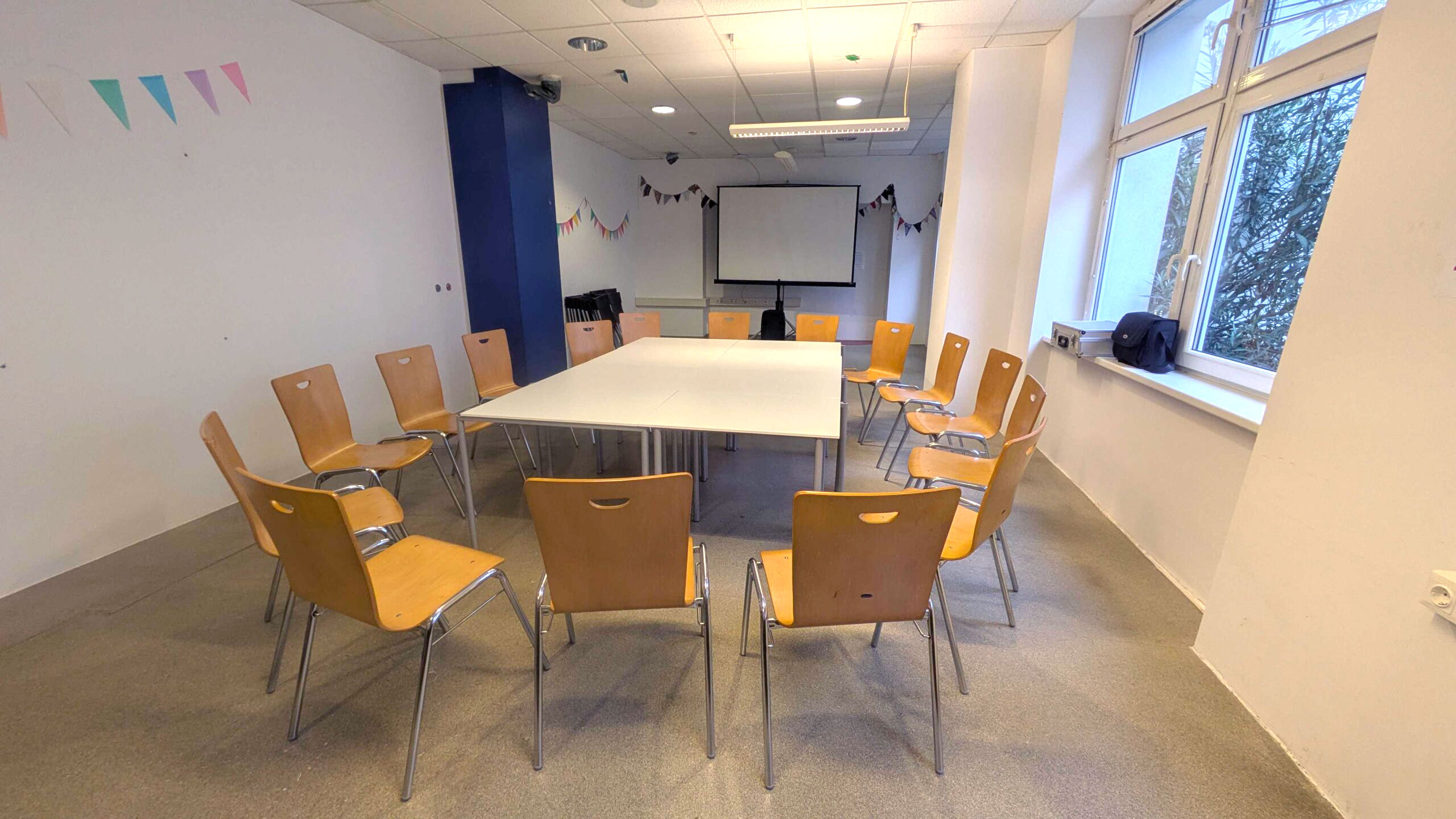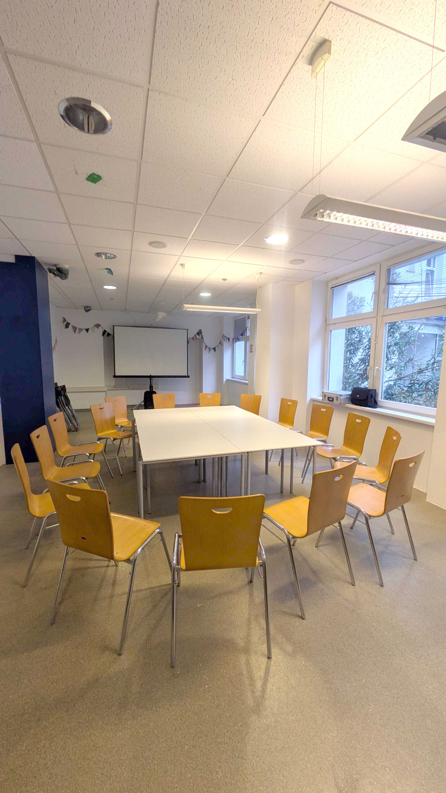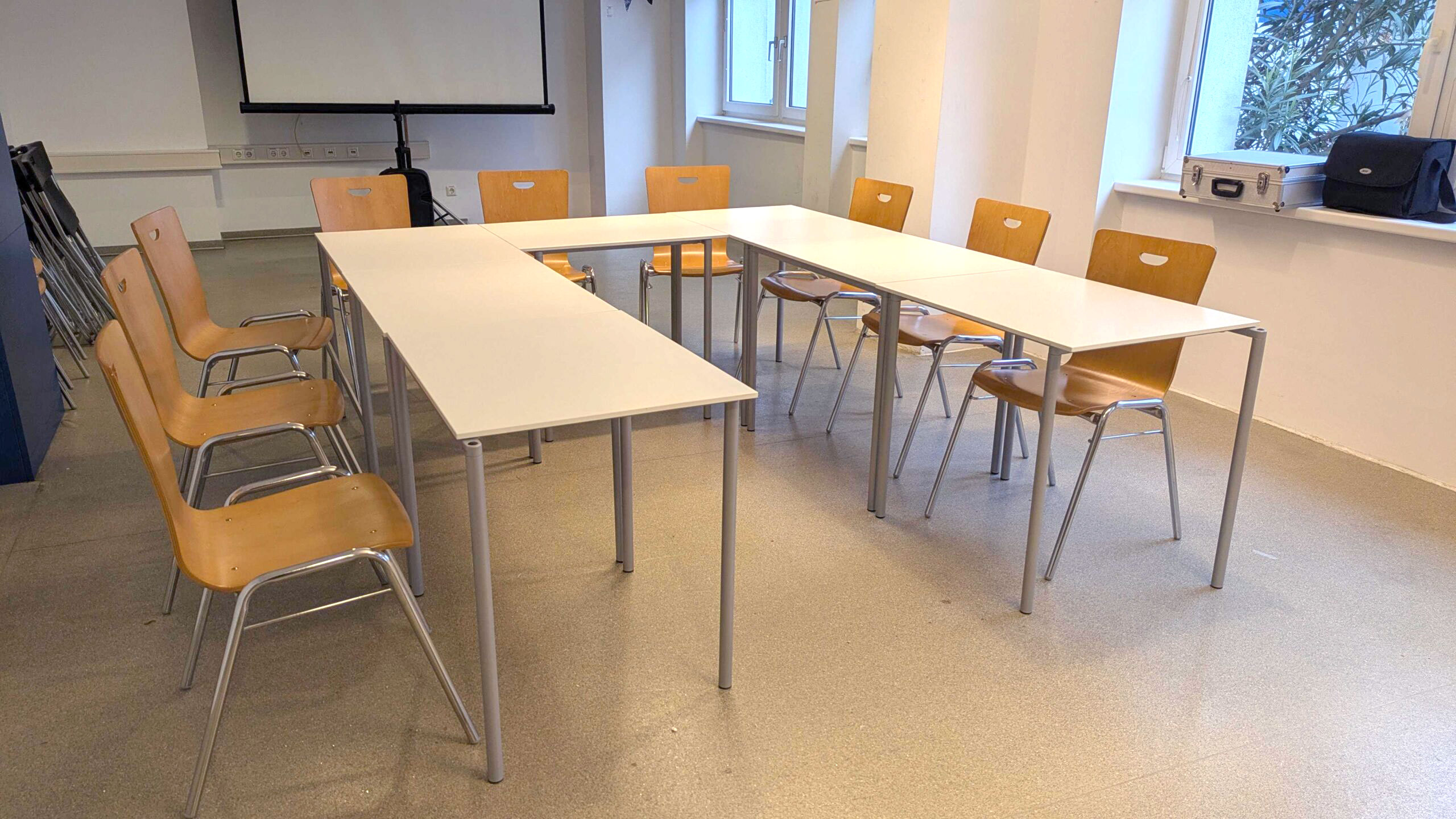 - Die Einrichtung lässt sich einfach an deine Bedürfnisse anpassen – egal, ob du Stuhlreihen für eine Präsentation, Tische für gemeinsames Arbeiten oder einen freien Raum für Bewegung brauchst. Es gibt 8 Tische und 30 Sessel.