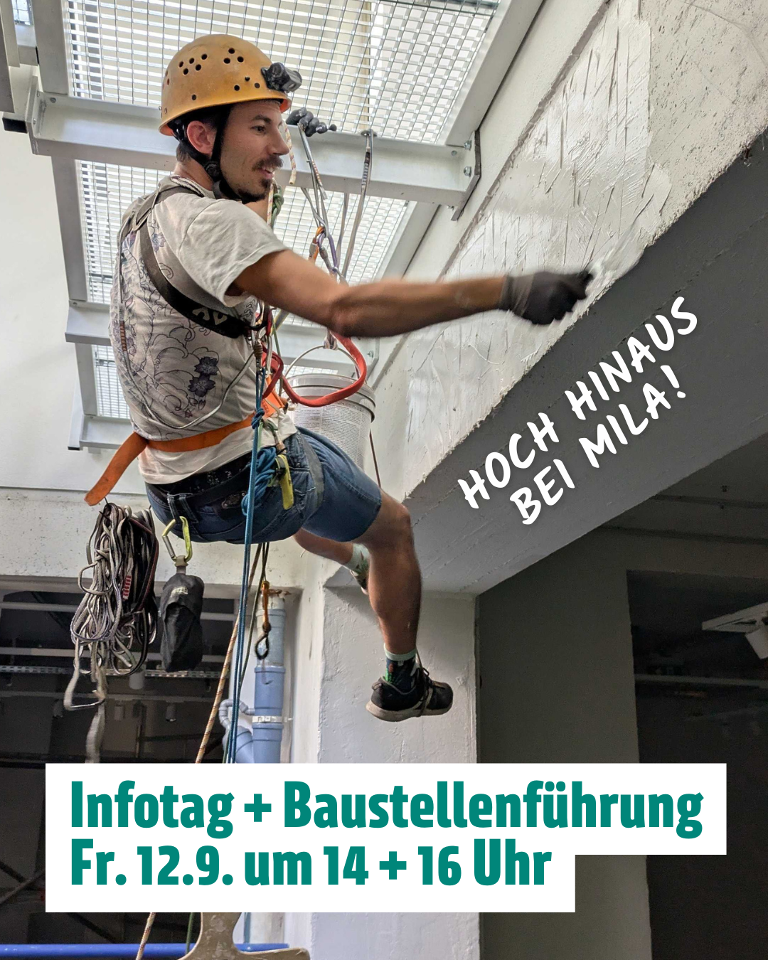 Hoch hinaus bei MILA! 🧗‍♀️✨ Auf der Baustelle wird gespachtelt, geschliffen und fleißig gearbeitet – sogar mit Klettereinlage! 💪 Neugierig, wie der MILA Mitmach-Supermarkt gerade Form annimmt?