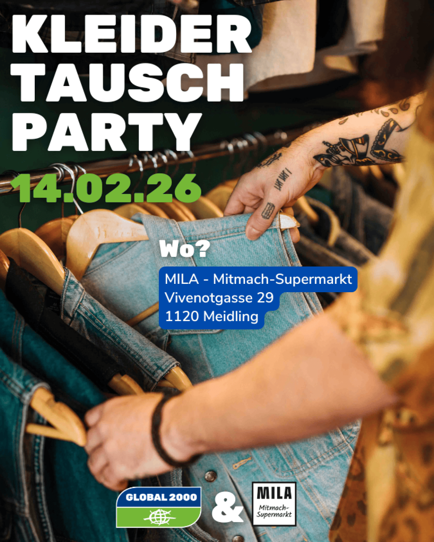 Komm zu unserer gemeinsamen Kleidertauschparty mit GLOBAL 2000: Finde tolle Secondhand-Stücke und genieß leckere Snacks & Kaffee gegen freie Spende. Wer mag, ist herzlich eingeladen, auch einen Schnuppereinkauf oder eine Führung im MILA Mitmach-Supermarkt zu machen.