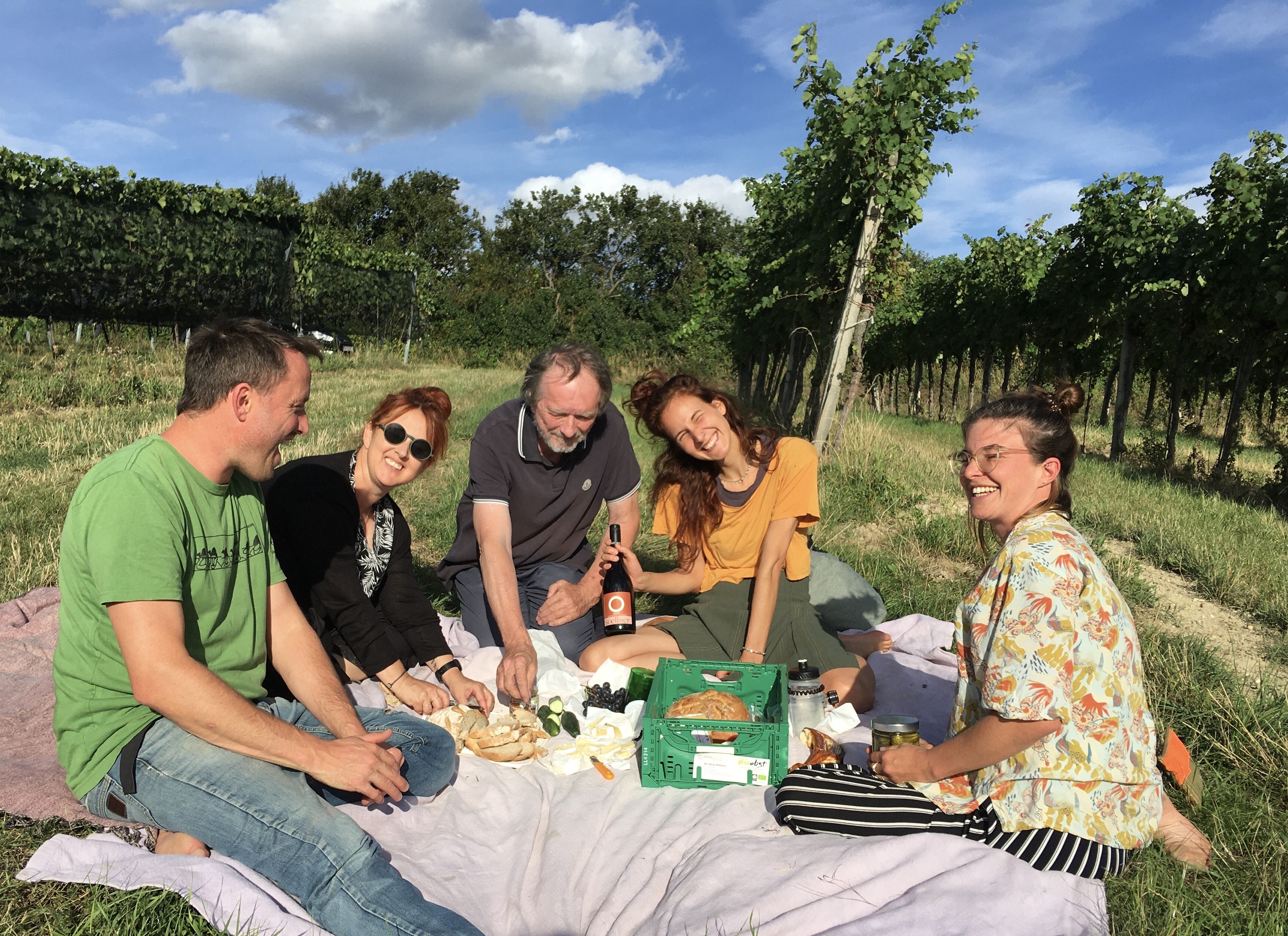Verlässlichen Rotwein-Trinkgenuss bietet der „Oibelos“ auch bei dieser Verkostung, für Liebe auf den ersten Schluck sorgt der „Pinot Noir, 2020“. Der Winzer teilt meine Begeisterung für „mehr Blauburgunder“ nur bedingt, ergänzt lakonisch: „Es gibt gute, es gibt schlechte; und von manchen bekomme ich nur Kopfweh.“ Sagts und schmeißt uns kurzerhand raus, weil er mit der Gattin noch zum Essen ausgeht. Wir hängen noch ein Picknick mit sensationeller Aussicht auf Schneeberg, Ötscher und Stift Göttweig dran. Wir schmatzen hungrig Käse und Brot, ich (Heimfahrt-Chauffeurin) schlürfe Wasser und die anderen Oibelos dazu…